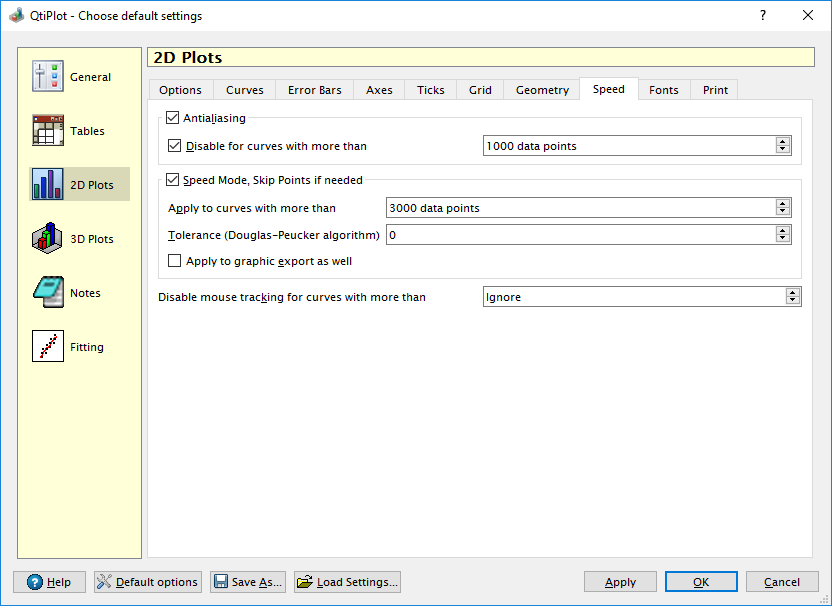 The Speed tab lets the user enable/disable antialiasing when drawing/redrawing 2D plots. Antialiasing is a major source of slow-down when rendering 2D plots. Unchecking the Antialiasing checkbox disables antialiasing for all curves, which probably will only be needed in extreme circumstances. Checking the Disable for curves with more than checkbox will disable antialiasing only for curves having data sets larger than the threshold set with the textbox to the right of the Disable for curves with more than checkbox. Disabling this option is probably not a good idea. The default is for both of these options to be enabled, with a threshold of 1000 data points. Proper setting of these options is essential to keeping the application responsive.