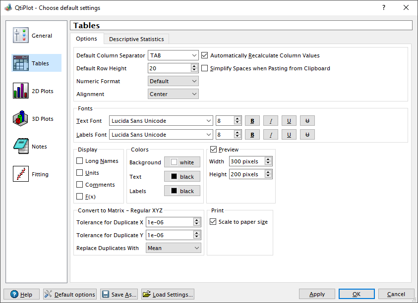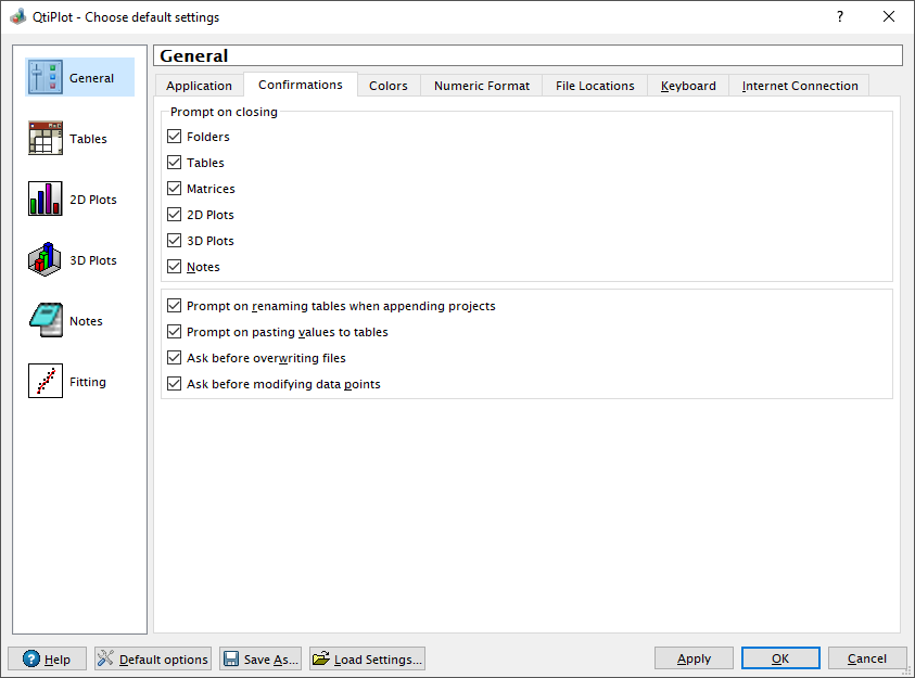 The preference dialog is used to customize the default behavior of QtiPlot. There are six pages of options which are selected using one of icons from the column on the left hand side of the dialog. The text box at the top of the dialog shows the name of the selected page. No matter which page is selected, there are always seven buttons along the bottom edge of the dialog: Help, Default Options, Save As, Load Settings, Apply, OK and Cancel.