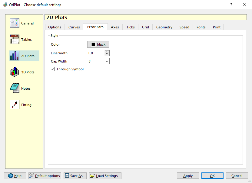 The Error Bars tab contains the controls that define the default style used when adding error bars to a 2D plot curve.