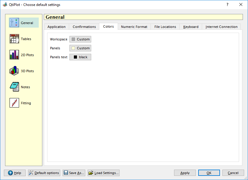 In this tab, you can change the default color for the QtiPlot workspace, the panel background color and the panel text color. Panels refer specifically to the Log Window and the Project explorer.