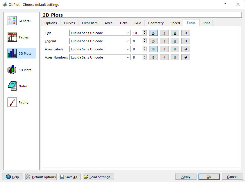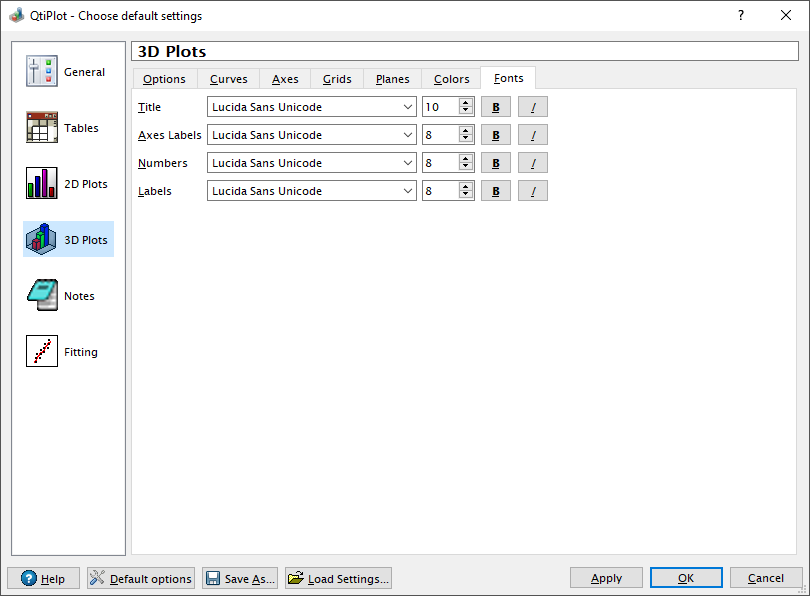 The Fonts tab defines the default fonts used when creating new plots. Options are provided for the plot Title, plot Legend, Axes Labels, and Axes Numbers.