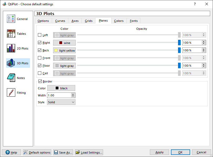 Using the Planes tab, it is possible to set a color filling for the six sides of the coordinate system. Please note that transparency of these planes is not correctly handled when exporting 3D plots to vectorial image formats (*.EPS, *PDF or *.SVG files). It is also possible to set a default colored Border for the sides of the coordinate system.